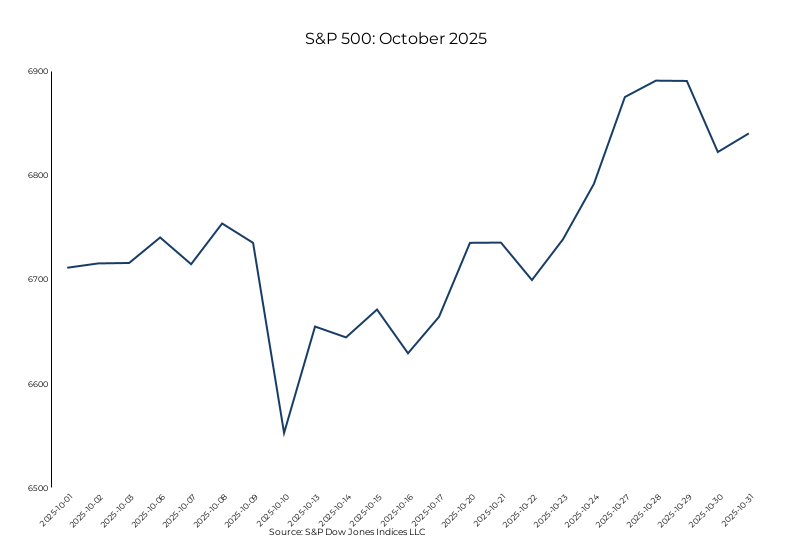 Six of the eleven S&P 500 sectors had positive returns. Five of the Magnificent Seven gained, with Meta and Microsoft declining. Volatility increased to 1.00%, from 0.69% in September. In October, 4 of the 23 trading days moved at least 1%, compared to none in September.Â